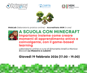 A scuola con Minecraft: creare momenti di apprendimento attivo e coinvolgente con il game-based learning Professional Academy Scuola 19 Gen 2026Il WebLab è un laboratorio artistico online, accreditato MIM (4 ore), dedicato all’esplorazione del Game-Based Learning come approccio metodologico, per favorire il coinvolgimento attivo degli studenti nei processi di apprendimento. Quota d’iscrizione individuale: € 35,00 (IVA esente) OFFERTA LIMITATA: SCONTO 15% per iscrizioni entro il 24 gennaio 2026 (Offerta valida solo per gli acquisti effettuati […]+ Continua