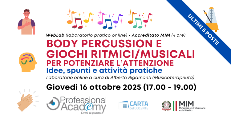 WebLab (Laboratorio artistico online) – Accreditato MIM (4 ore)BODY PERCUSSION E GIOCHI RITMICI/MUSICALI PER POTENZIARE L’ATTENZIONEIdee, spunti e attività praticheQuando: giovedì 16 ottobre 2025Orario:17.00 – 19.00Docente: Alberto Rigamonti (Psicologo e Musicoterapeuta specializzato in Musicoterapia Neurologica. Svolge attività di musicoterapia e comunicazione sonora presso Istituti Comprensivi Statali e sessioni individuali con bambini, ragazzi e adulti con difficoltà cognitive, motorie e relazionali)