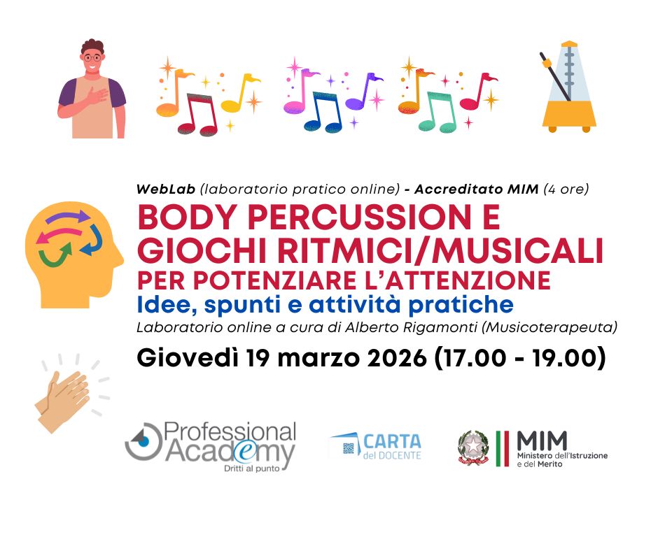 WebLab (Laboratorio artistico online) – Accreditato MIM (4 ore)BODY PERCUSSION E GIOCHI RITMICI/MUSICALI PER POTENZIARE L’ATTENZIONEIdee, spunti e attività praticheQuando: giovedì 19 marzo 2026Orario:17.00 – 19.00Docente: Alberto Rigamonti (Psicologo e Musicoterapeuta specializzato in Musicoterapia Neurologica. Svolge attività di musicoterapia e comunicazione sonora presso Istituti Comprensivi Statali e sessioni individuali con bambini, ragazzi e adulti con difficoltà cognitive, motorie e relazionali)