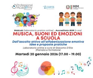 MUSICA, SUONI ED EMOZIONI A SCUOLA: Dall’ascolto attivo all’alfabetizzazione emotiva Professional Academy Scuola 03 Dic 2025Il WebLab è un laboratorio didattico-artistico online, accreditato MIM (4 ore), per progettare attività volte a promuovere l’ascolto attivo come porta d’accesso al riconoscimento delle proprie emozioni, trasformando suoni in colori, forme e segni. Quota d’iscrizione individuale: € 35,00 (IVA esente) OFFERTA LIMITATA: SCONTO 15% (€ 30,00) per iscrizioni entro il 24 dicembre 2025 (Offerta […]+ Continua